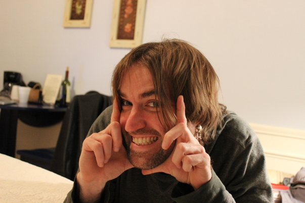 This is a man smiling and making a silly pose for the camera and is sitting close to a table with a bottle of wine on it. |
