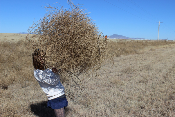 A young woman dressed in a blue mini skirt, fishnet stockings, and a white pullover sweatshirt stands in the middle of a field of brown, dried grass holding a large tumbleweed in front of her face, hiding it from the camera.
