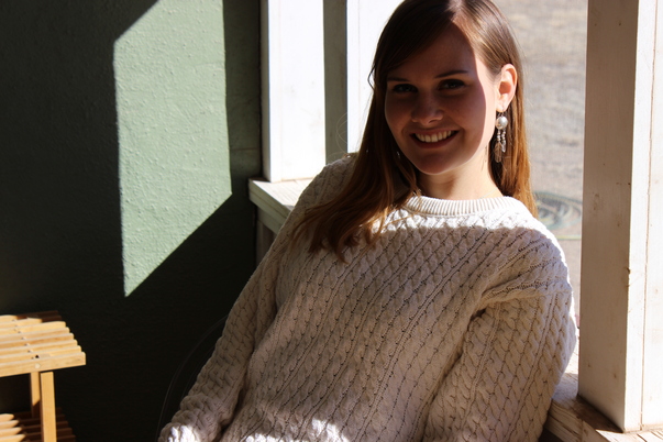 beautiful woman, sitting by a well lite window, smiling at someone holding a camera. |