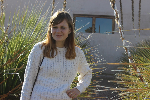 A woman wearing a white, knitted sweater with her hand on her hip. |