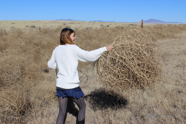 This is a woman wearing a blue skirt, grey tights, and a white sweater and holding a tumbleweed. |