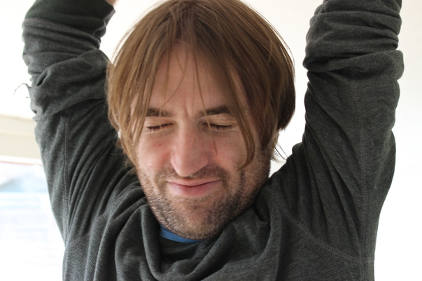 A man standing up in a gray shirt that is in the middle of stretching. |