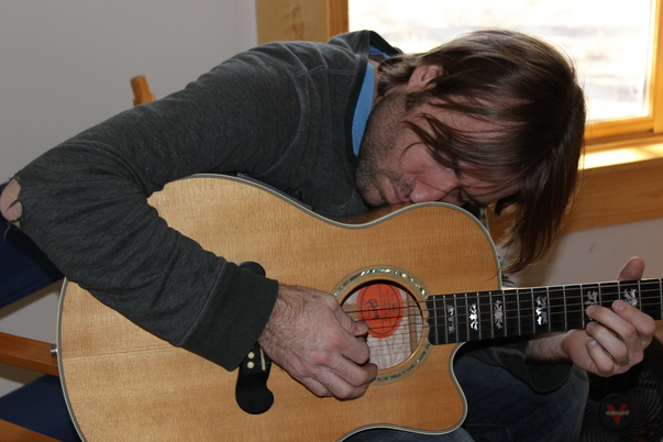 This is a man playing what appears to be a Gibson acoustic guitar. |