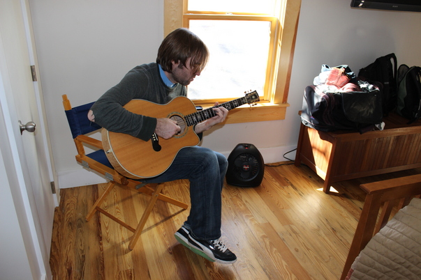 A young hipster with scruffy playing an accoustic guitar in a living room. |