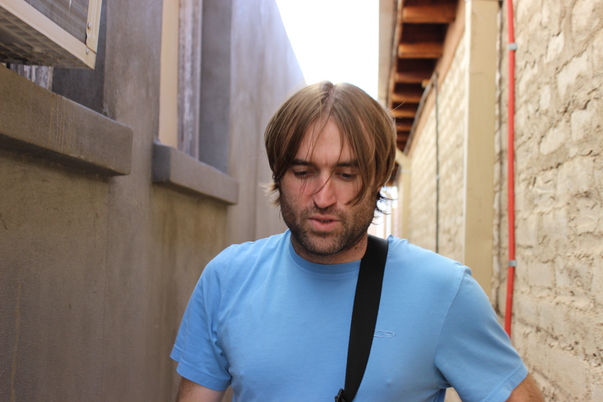 A scruffy man in a blue shirt walks down a narrow passageway. |
