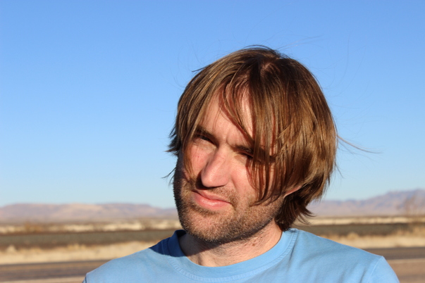 An unshaven man wearing a blue shirt tilts his head and squints. |