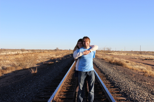 Two people embrace in the middle of an empty train track with empty fields on either side. |