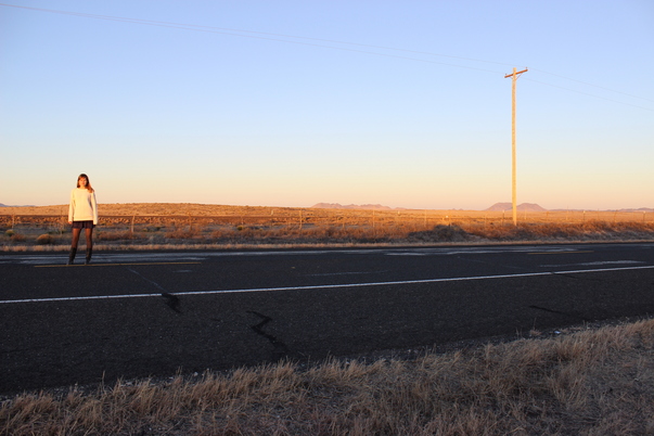 This is a young woman wearing a white sweater standing off the side of a road while the sun is setting. |