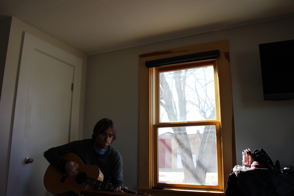 A man sits alone in a room playing his guitar as the cold sunshine of winter streams through the window. |