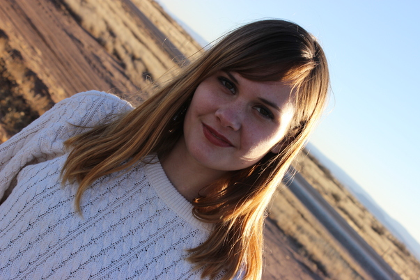This is a young woman with a white sweater, brown eyes, red lips, and light brown hair. |