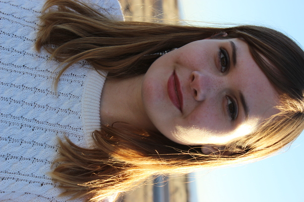 A smiling girl with brown hair wearing a white cable knit sweater. |