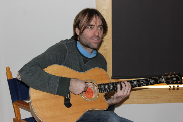 A unshaven man plays guitar while sitting in a folding chair with a dark blue canvas back and seat. |