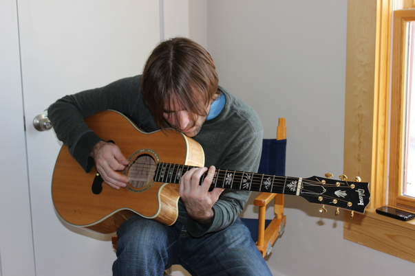 A man sitting in a chair practicing on his very beautiful acoustic guitar. |