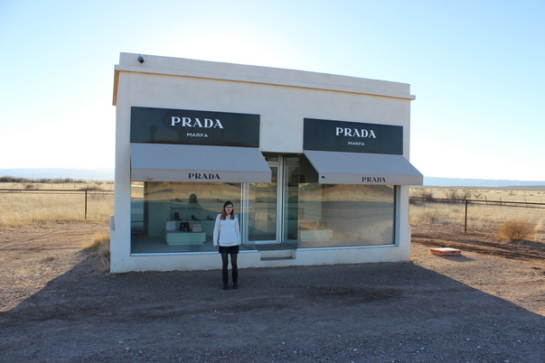 This is a girl wearing a white sweater that is standing in front of a Prada store that is next to a field. |