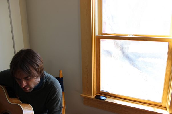 A man is playing a guitar near a window with wooden frames. |