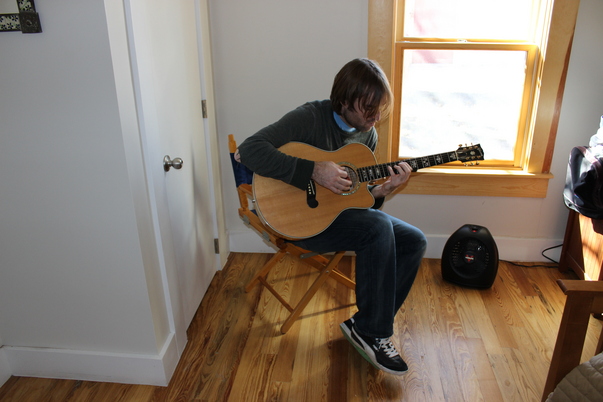 A man with shaggy brown hair is wearing a brown sweater and playing a wooden guitar. |