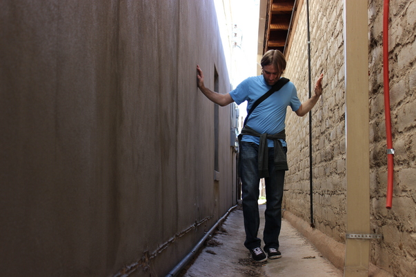A man is wearing a blue shirt, jeans, and black shoes while walking through a narrow alley. |