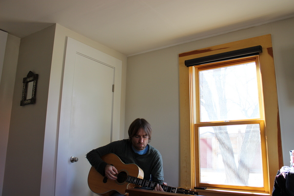 This is a man sitting between a door and a window and playing an acoustic guitar. |