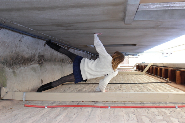 Woman, in a skirt and sweater, standing in an ally with one hand on each wall. |