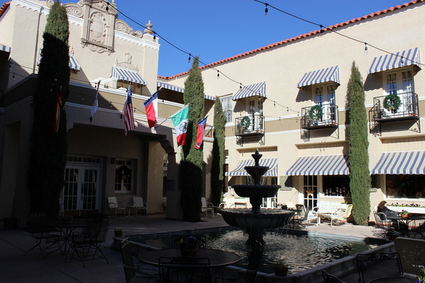 View of a court yard with a fountain and tables and a view of flags and balconies. |