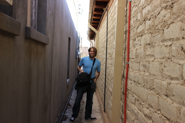 A man with long brown hair wearing a blue shirt stands in a narrow alley between two buildings. |