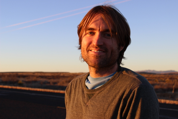 A guy with brown hair and a kind smile, wearing a gray sweater and blue undershirt, stands near a roadside passing through barren country. |