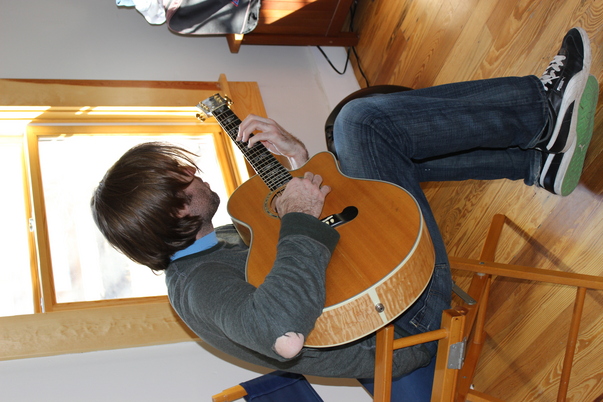 A seated man, with a shaggy haircut, wearing blue jeans and a sweater with a hole in the elbow, plays an acoustic guitar |