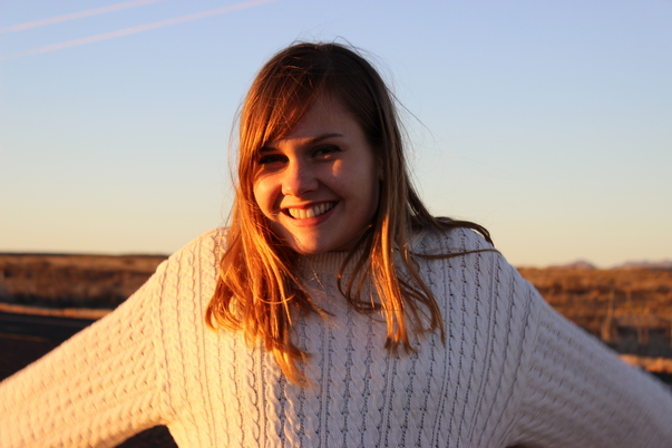 Here stands a gorgeous woman with her arms stretched showcasing a beautiful white knitted sweater on the open road. |