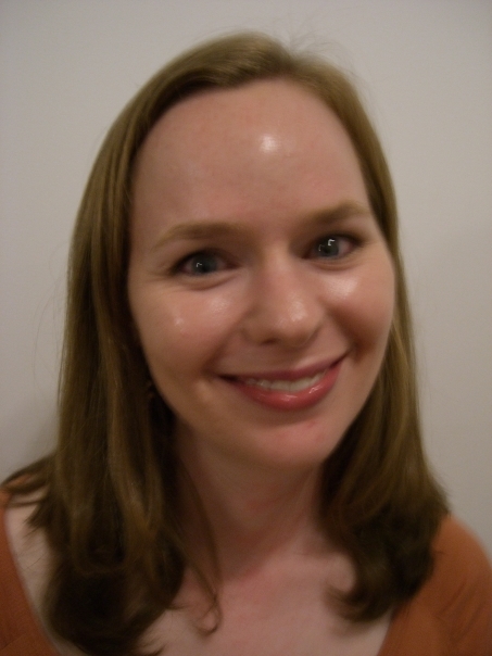A smiling woman with long light brown hair, and you can see some of her orange shirt.