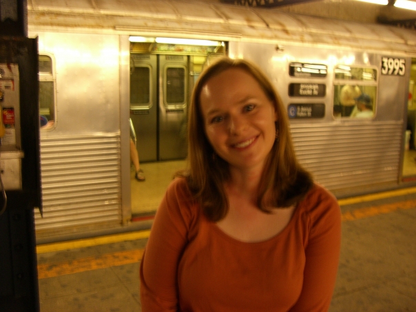 A woman wearing an orange shirt smiles for the camera after exiting from the C Train.