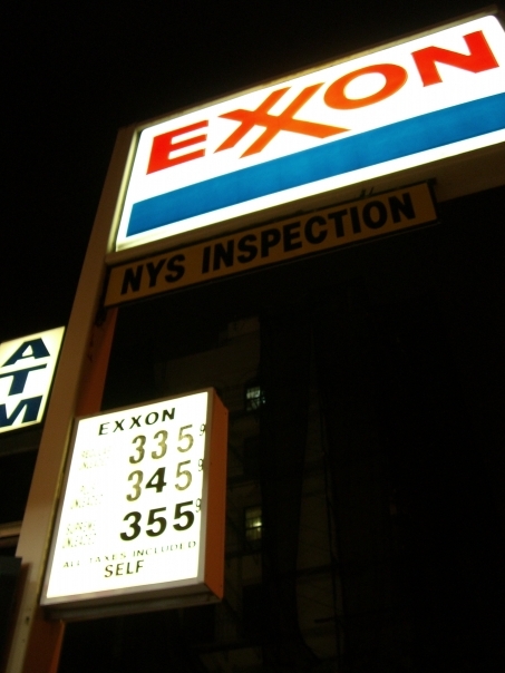 A sideways picture of EXXON gas. 3.35 for regular, 3.45 for plus, and 3.55 for premium.