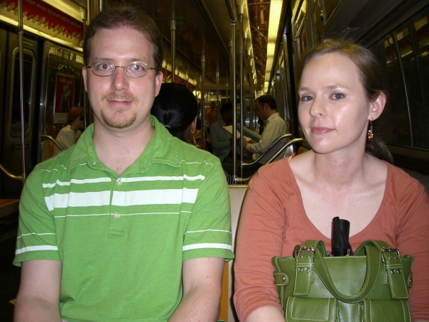 Eric and Amy sitting on the subway.