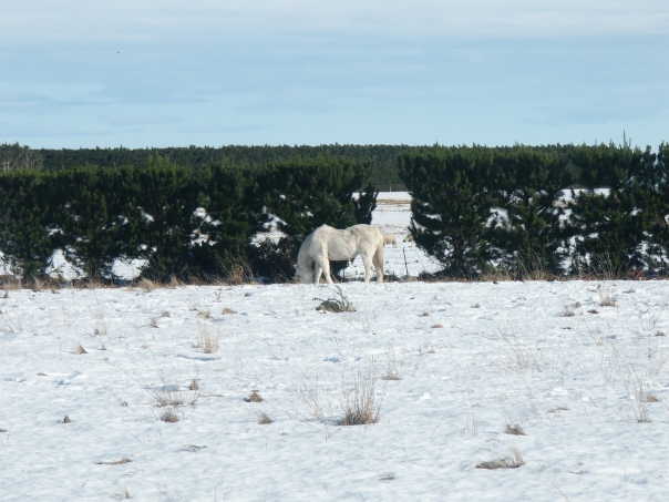 A lone white horse grazes on sparse brown grass patches in a snow-covered field in front of green bushes.