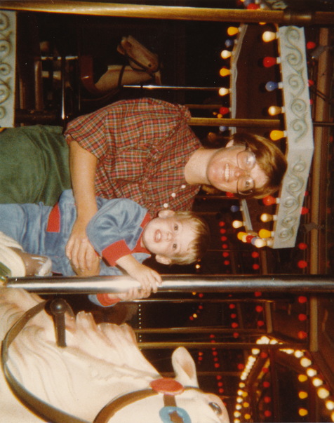 A man with red hair rides on a carousel horse with a blond toddler wearing a blue and red shirt. |