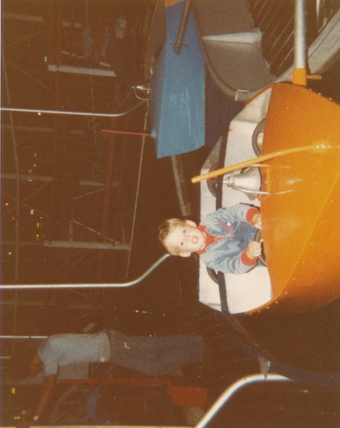 A very scared looking child rides an amusement park ride in the shape of a small boat. |