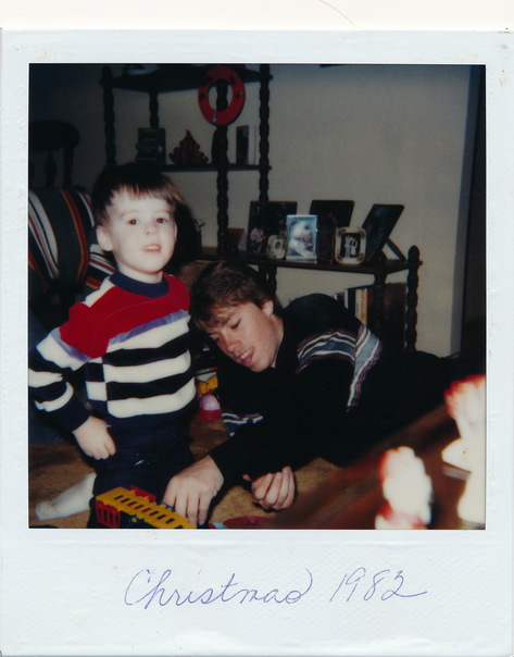 a teenage boy and a little boy playing with a train in the photo |