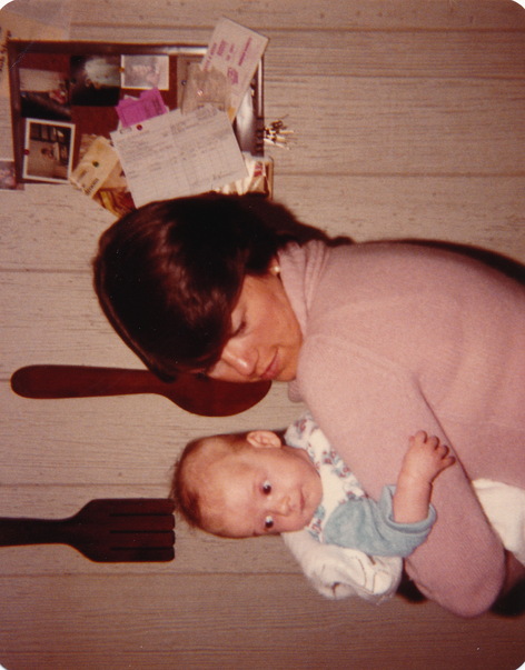 this young brown haired woman is holding a cute infant dresssed in a blue and white shirt. |