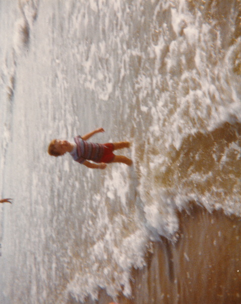 A young boy in red shorts with a striped shirt plays in the surf at a beach location. |