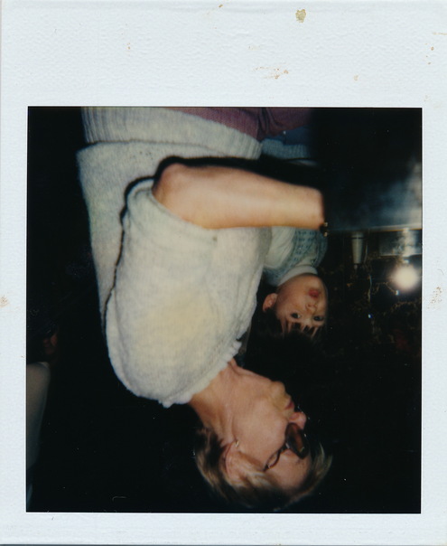 A lady with glasses stands near a baby boy on an upside down pic. |
