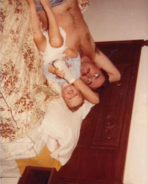 A shirtless man in glasses is laying on top of a bed next to a child drinking from a bottle, and both people are smiling. |