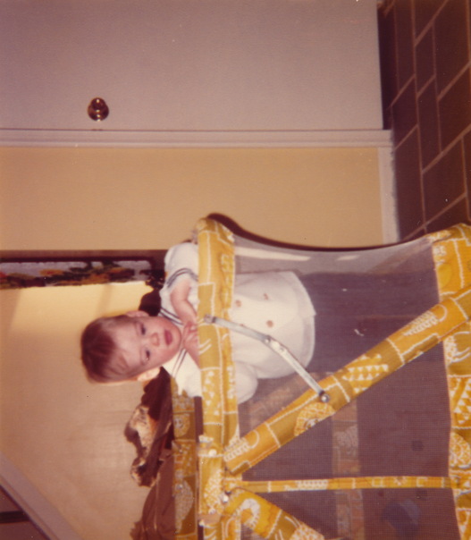 This old photo shows a cute blond toddler standing in his yellow and white playpen. |