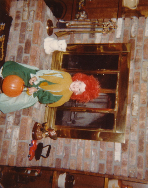 A child in a Halloween costume with a bright orange wig, holding a pumpkin bucket, sitting in front of a brick fireplace with toys and a cat figurine on it.