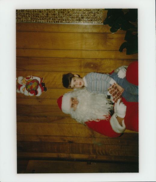 This is a little boy wearing a striped shirt sitting on a Santa Clauses lap in front of wall paneling that gives off a wood-like appearance. |