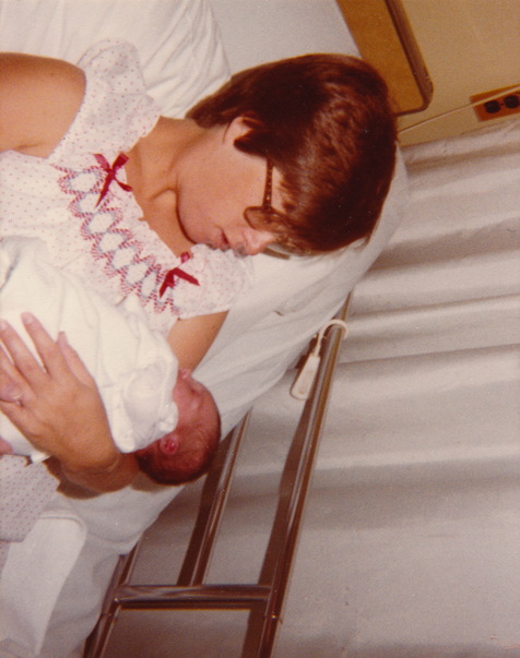 A vintage photo shows a young mother in a hospital bed holding her infant son. |