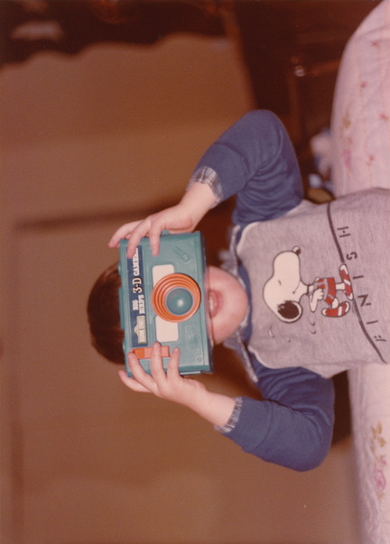 This is a sideways photo of a boy looking into a toy camera. |