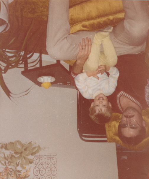 A son and Dad sitting down, the little boy is wearing yellow pants. |