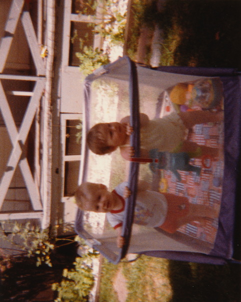 Two toddlers are inside of a play pen in the yard on a sunny day. |