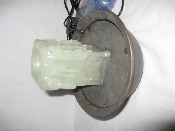 A odd block of candle is resting on a base that has lava like wax dripping down the sides.