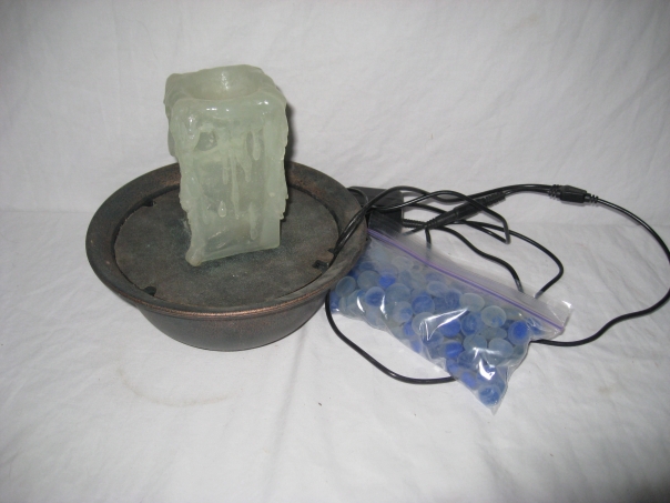 A small electric water fall with decorative rocks with it