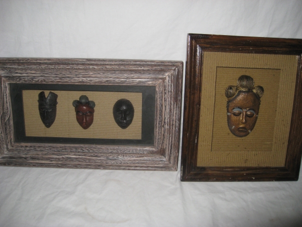 Two framed pieces of art; 3 carved wooden faces of varying dark neutral colors with closed eyes on the left, 1 carved wooden, bronze colored face with closed eyes and 3 hair buns on the right.